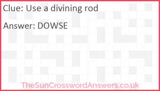 Use A Divining Rod - Crossword Clue Answers The crossword clue Use a divining rod with 5 letters was last seen on the August 30, 2022. We think the likely answer to this clue is DOWSE. Use a divining rod Crossword Clue Use a divining rod NYT Crossword Clue Answers are listed below and every time we find a new solution for this clue, we add it on the answers list down below ... Use divining rod - Crossword Clue, Answer and Explanation 'use divining rod' is the definition. (I've seen this before) This is all the clue. (Other definitions for dowse that I've seen before include "Look for ...